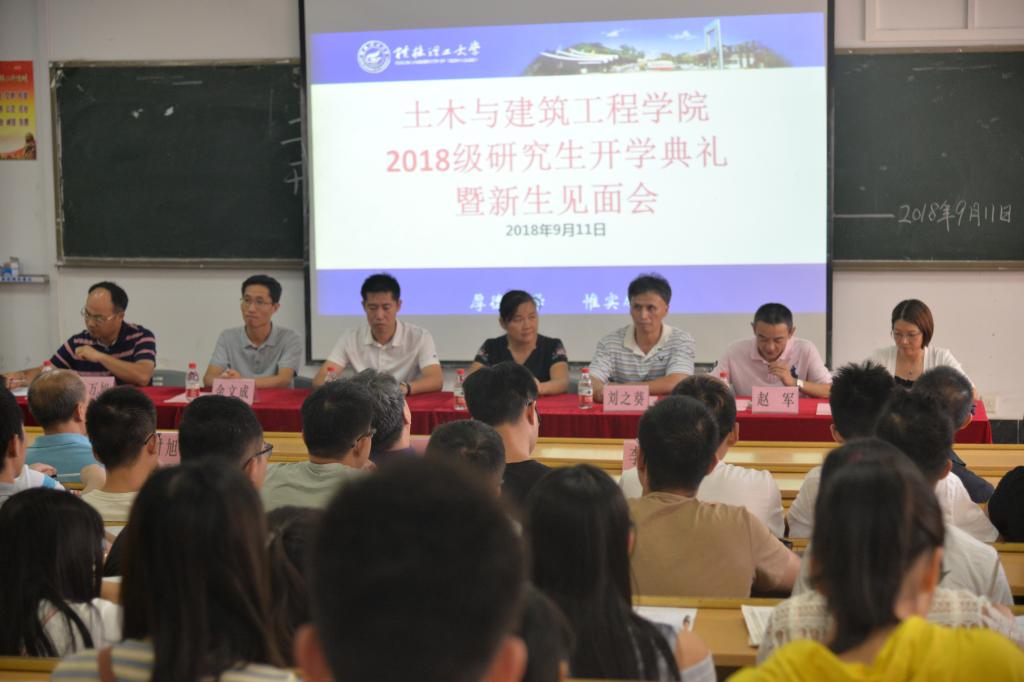 首先,刘之葵副院长(主持工作)介绍了学院发展历史、基本现况及科研条件,表达了对同学们的殷切期望。而后,导师代表朱万旭教授发言。朱老师勉励2018级新生要老老实实做人,扎扎实实做学问,并作为导师代表承诺将履行好导师的职责和义务,竭尽全力指导好学生。随后,2016级学生代表章明明同学代表发言,他表达了对师弟师妹们的热烈欢迎,同时也希望新一届师弟师妹能继续发扬桂工精神,不断超越自我,有所建树。接着,2018级新生代表刘莉同学发言。她表达了初入桂工的喜悦之情,以及希望同学们能够坚定理想,树立目标,秉承“厚德笃学,惟实励新”的校训,在学习路上开拓进取,不仅要实现自己的梦,更要实现我们的民族梦、中国梦。最后,学院党委书记熊英向全体新生致辞,她代表土木与建筑工程学院对新同学的到来表示热烈的欢迎和衷心的祝贺。她希望各位研究生始终保持求学成才的初心,珍惜大好时光,努力成为自然规律的探索者和文化奥秘的发现者,为学院的发展注入新的活力和动力,努力成为国家和社会需要的栋梁之才。