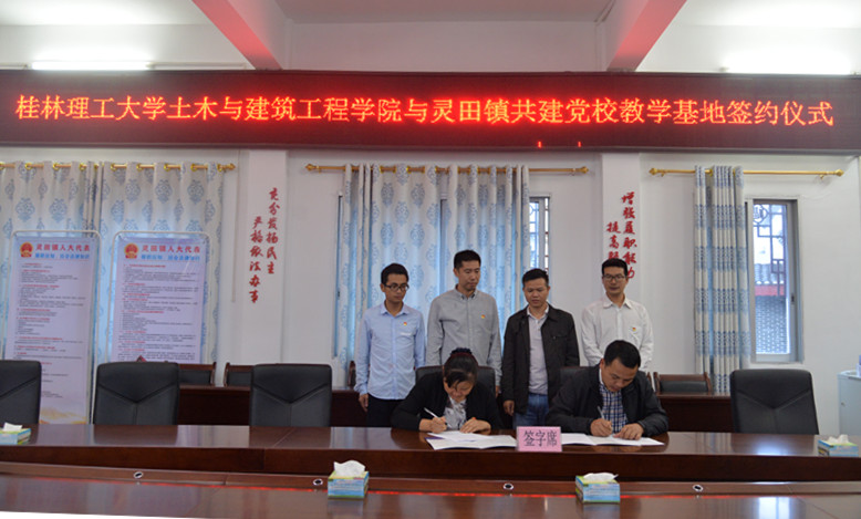 在纪念馆前,灵川县灵田镇党委书记曾兵为学员们讲述了桂北武装起义的历史意义和影响,讲述了修建灵田起义纪念公园和纪念馆的初衷和历程,希望在与我校党委党校的共建下,灵田起义的精神会薪火相传、影响更多的人。土木与建筑工程学院党委书记兼分党校校长熊英代表学校党委党校对灵田镇党委的大力支持表示感谢,希望广大师生不忘先烈遗志,自觉担当时代重任,立足本职岗位撸起袖子加油干,为建设中国特色社会主义、实现中华民族伟大复兴的中国梦而努力奋斗。在大家的掌声中,灵川县灵田镇党委书记曾兵与土木与建筑工程学院党委书记兼分党校校长熊英共同为“桂北武装起义纪念地党校现场教学基地”进行了揭牌。之后,双方签订了现场教学基地共建协议书。