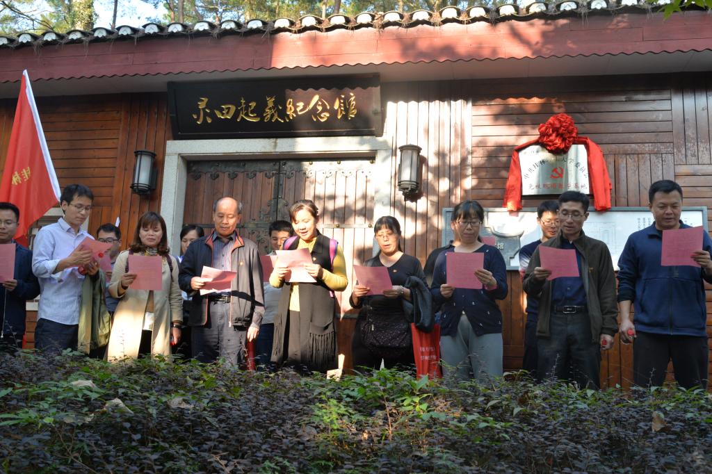 2018年11月17日下午,学院教工党员在学院党委的组织下赴灵川县灵田镇开展了桂北武装起义的纪念学习。在起义广场上,教工党员们举起右手面对党旗重温了入党誓词。在文化长廊里,安邦国老师结合壁画介绍了灵田起义的过程和灵田起义胜利的历史意义。