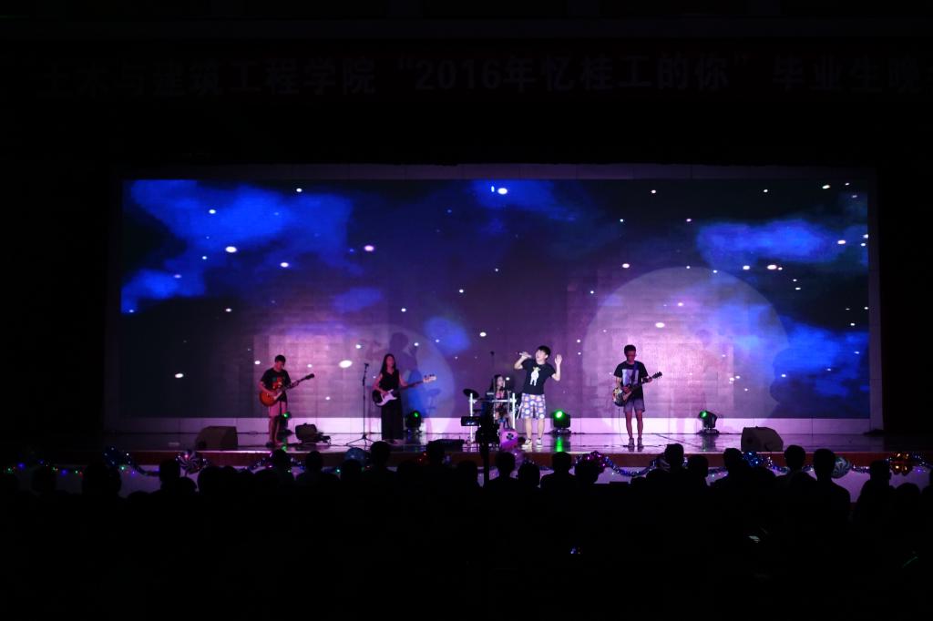 伴随一段活力四射的开场舞《Fantastic girl》,正式拉开晚会了序幕;紧接着一段“大学的那些事”的视频将即将离校的毕业生们带回了最初梦想开始的那个地方,带领着同学们共同回忆美好的校园生活、同学情、师生情。随后,婀娜多姿的傣族舞《缅桂花开香朵朵》,中国好声音桂林赛区冠军、建筑学专业的翟轩宇独唱的《野子》,点燃了全场观众的激情。以我校研究生支教团为背景编舞的现代舞《大山支教》充分了展现我校学子爱之宽,心之大,勇于追求梦想的怒放青春。合唱《青春圆舞曲》、双人舞《卷珠帘》、乐队演唱《Bae bike by bus》、古典舞《且吟春雨》将晚会推向了高潮,也盛满了毕业生们满怀感动与不舍。最后,由宾国澍老师的一曲《朋友别哭》,用歌声诉说对学生恋恋不舍的惜别之情,用音符传递对毕业生的美好祝愿,为晚会拉下圆满的帷幕。