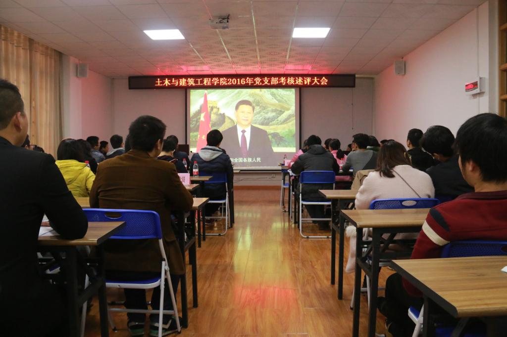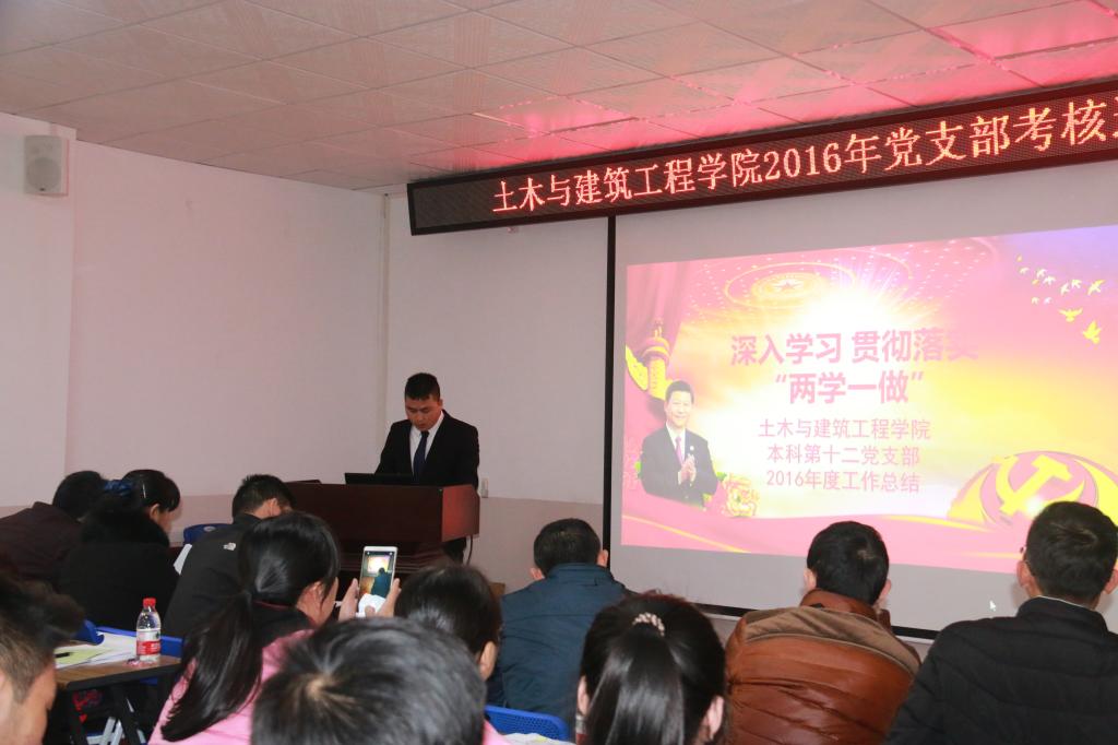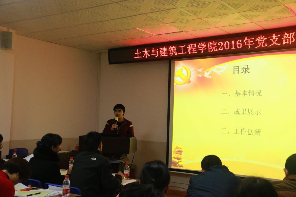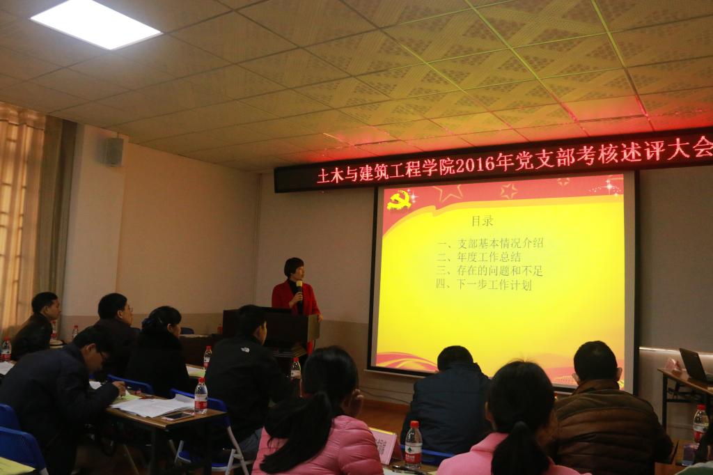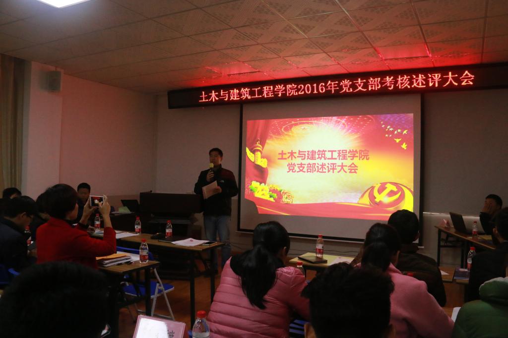为进一步加强党支部建设,推动我院党支部工作科学化和规范化发展,促进党支部战斗堡垒作用有效发挥,根据学校和学院工作安排,2017年1月3日下午,土木与建筑工程学院党委在4203会议室召开2016年党支部考核述评大会。学院3个教工党支部,5个研究生支部,6个本科生支部参加了此次考核述评。学院党委书记熊英同志,副书记王盛同志,学院党委委员和党支部考核工作领导小组成员出席此次大会,并担任评委,学院各党支部选派党员列席参加了此次大会。大会由学院党委副书记王盛老师主持。