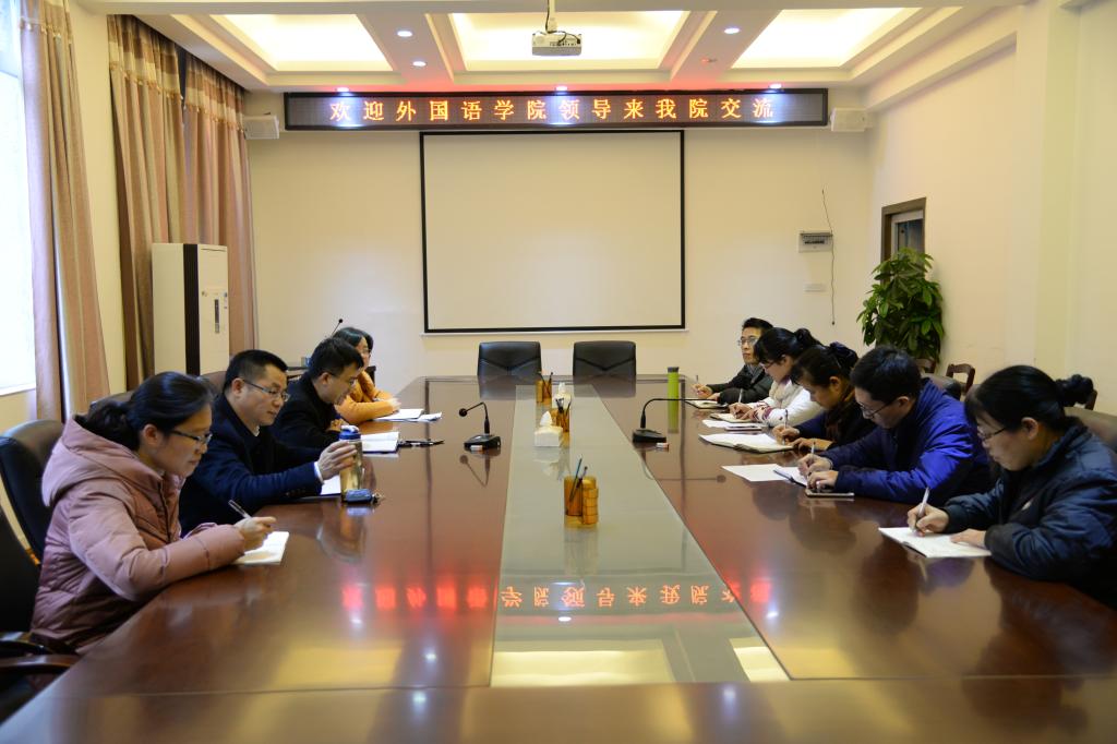 3月8日上午,外国语学院院长全克林、副院长陈湘柳一行4人到学院交流英语教学及学院学生英语学习情况。学院党委书记熊英、副院长余文成、学院学工办、学院教学秘书等人在4222会议室进行了座谈交流。
