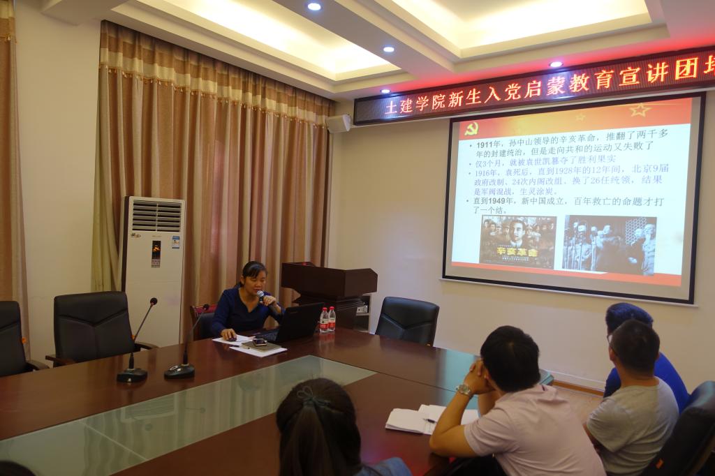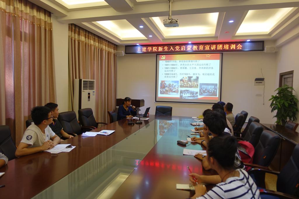 2016年10月11日下午,土木与建筑工程学院党委在4222会议室召开新生入党启蒙教育宣讲团培训会,培训会由学院党委书记熊英老师主讲,学院各个党支部选派组成的宣讲团成员参加了此次培训。