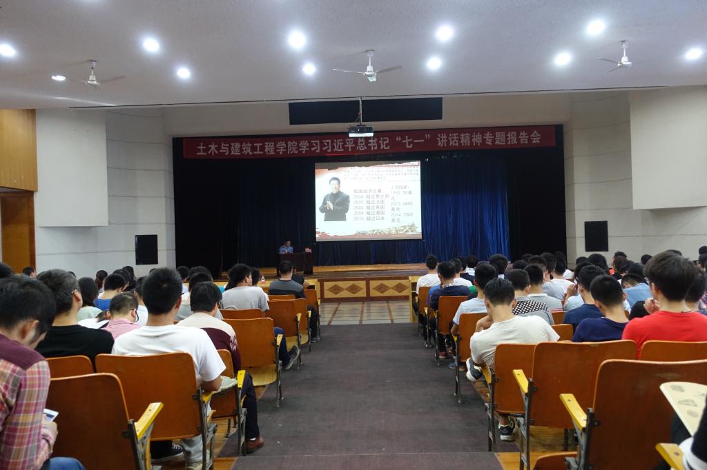 2016年10月25日下午,土建学院党委组织全院的教工和学生党员在南校区礼堂举办了学习习近平总书记“七一”重要讲话精神专题报告会,报告会由空军空降兵学院徐炳林教授主讲,报告会由学院党委书记熊英老师主持,全院师生党员参加了此次学习。