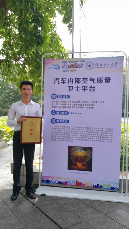 9月3-4日第二届中国“互联网+”大学生创新创业大赛广西选拔赛决赛在广西大学隆重举行,我院以土木工程(工民建)2013-1班吴志国为组长的“汽车内部空气质量卫士平台”项目(指导教师唐丽华)经学校上报,通过自治区专家预审,在9月3日接受专家组公开答辩与作品展示。最终,“汽车内部空气质量卫士平台”项目荣获广西选拔赛决赛创意组金奖。