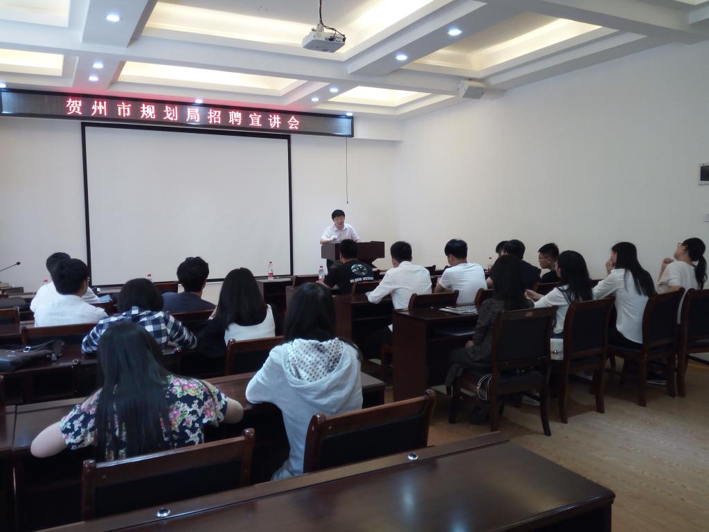 5月9日下午,贺州市规划局在我院4204会议室举行专场招聘宣讲会,我院城乡规划及相关专业学生参加了此次宣讲会。会上, 贺州市规划局李晖副局长为同学们介绍了规划局的概况及工作流程,并就城乡规划行业未来的发展形势作了深入浅出的分析,鼓励同学们积极投身到贺州市的城乡规划建设中。随后规划局办公室负责人李木龙、规划设计院吴天宇院长、建筑管理科陶静科长分别就自己所负责的业务领域为同学们进行了详细的介绍,并耐心解答了同学们的提问,现场气氛活跃,参会同学对规划局的工作岗位表现出了浓厚的兴趣,表示会认真考虑选择自己将来的工作及实习单位。