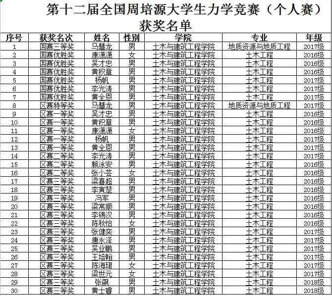 日前,中国力学学会发布了第十二届全国周培源大学生力学竞赛(个人赛)获奖名单,我院学子马慧龙斩获国赛三等奖,康潇潇、吴才忠、黄积章、杨帆、李光涛、黄全恩斩获国赛优胜奖,马慧龙斩获区特等奖,康潇潇等5名学生斩获区级一等奖,李光涛等3名学生斩获区级二等奖,梁喜超等14名学生斩获区级三等奖。
