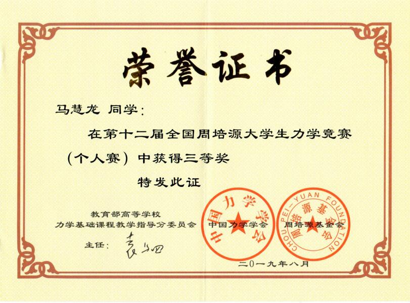 马慧龙同学获国赛三等奖