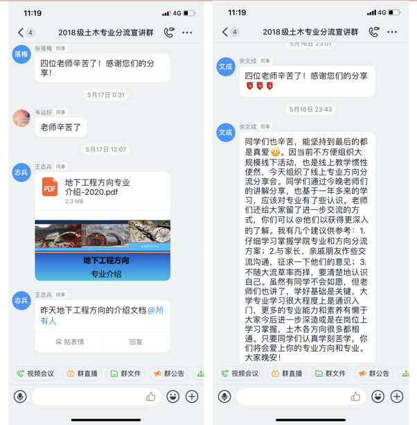 为保证土木分流工作顺利进行,明确土木工程分流各项工作安排以及进行专业方向介绍,5月16日,学院通过钉钉、腾讯课堂等网络方式召开2018级学生土木工程专业分流宣讲会。余文成副院长参与指导,曹振中老师、卢春玲老师、刘其舟老师、王志兵老师作为岩土教研室、道桥教研室、工民建教研室、地向下工程教研室代表老师出席会议,张落梅老师、2018级辅导员余东东、贾浩雨主持会议。