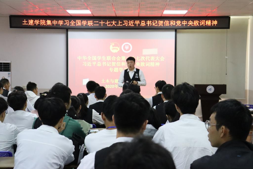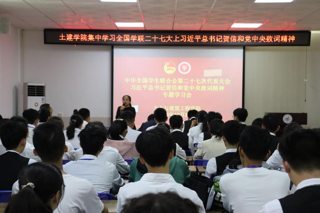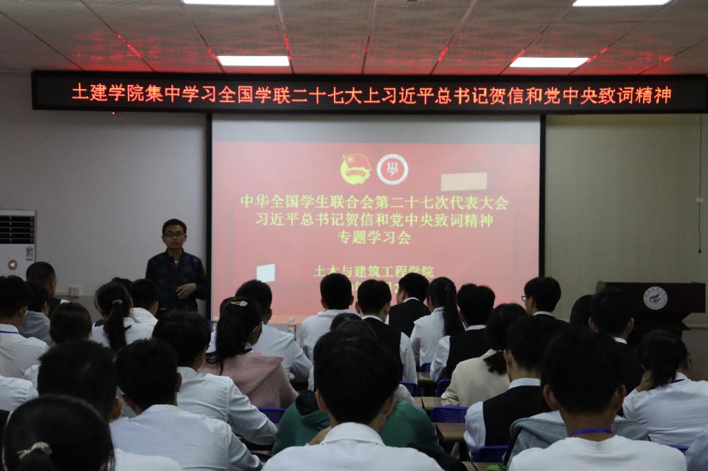 10月24日上午,土木与建筑工程学院在屏风校区4203会议室组织学习全国学联二十七大上习近平总书记贺信与党中央致词精神宣讲会,会议旨在号召同学们发扬团结、敬业、吃刻苦耐劳的光荣传统,提高我院学生干部的工作能力和工作积极性。学院党委副书记唐丽华、团委副书记安邦国以及学院团委、学生会全体成员参加本次会议,大会由团委副书记叶孝炳主持。
