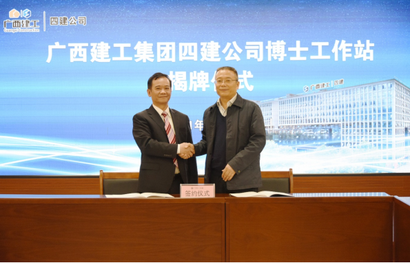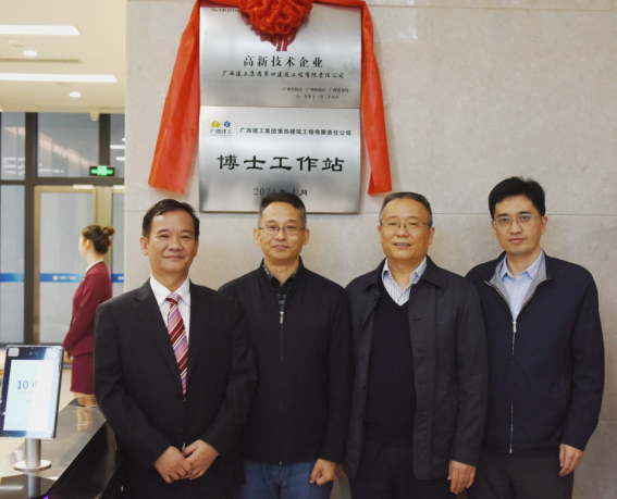 4月7日,学校与广西建工第四建筑工程集团有限公司(以下简称“四建公司”)联合成立的博士工作站在四建公司举行揭牌仪式。学校副校长王敦球、广西建工集团总工程师肖玉明、学校科技处处长王磊、学院副院长张树光及驻站博士等出席揭牌仪式并进行了深入交流。