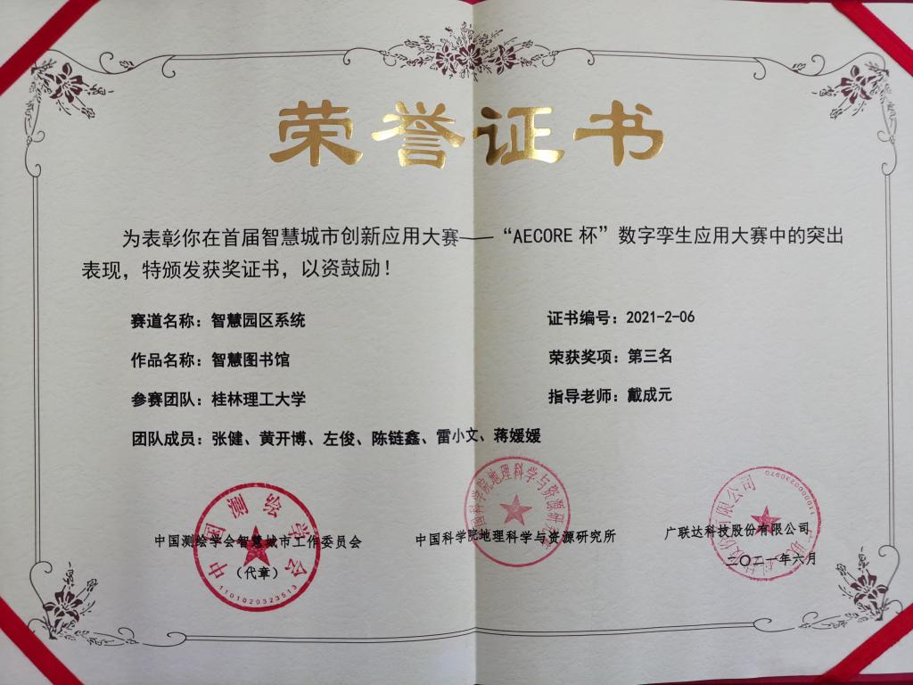 我校土木与建筑工程学院共派出两支队伍参加本次大赛,最后,由戴成元老师指导,张建(工程管理18级)、黄开博(土木工程18级)、左俊(土木与建筑工程研二)、陈链鑫(土木与建筑工程研二)、雷小文(土木工程18级)和蒋媛媛(工程管理18级)等六名同学组成的队伍在“智慧园区系统”赛道获得三等奖。