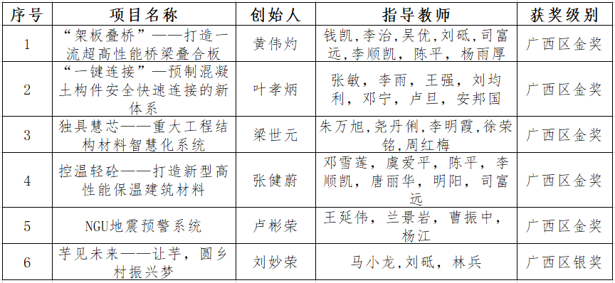 经过7月19日至21日激烈的项目路演答辩角逐,我院项目《“架板叠桥”——打造一流超高性能桥梁叠合板》(指导老师:钱凯、李治等,学生负责人:黄伟灼)、《“一键连接”—预制混凝土构件安全快速连接的新体系》(指导老师:张敏、李雨等,学生负责人:叶孝炳)、《独具慧芯——重大工程结构材料智慧化系统》(指导老师:朱万旭、尧丹俐等,学生负责人:梁世元)、《控温轻砼——打造新型高性能保温建筑材料》(指导老师:邓雪莲、虞爱平等,学生负责人:张健蔚)和《NGU地震预警系统》(指导老师:王延伟,兰景岩等,学生负责人:卢彬荣)荣获广西区选拔赛金奖。