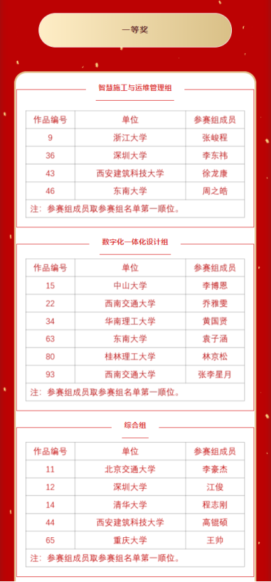 获得一等奖的学校包括:浙江大学,深圳大学,清华大学,桂林理工大学、东南大学、中山大学,西南交通大学、西安建筑科技大学、北京交通大学,重庆大学等大学。