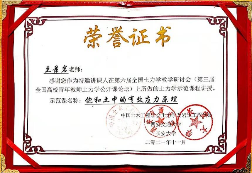 我院岩土教研室兰景岩老师受特邀,以“饱和土有效应力原理”知识点与来自全国32所高校的青年教师进行了土力学讲课交流,获得清华大学李广信教授、西安交通大学廖红建教授等点评专家高度赞扬和肯定,并获得“示范课”荣誉。