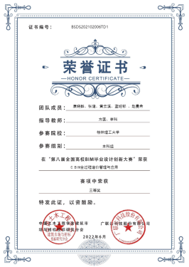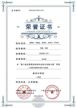 本次比赛是将目前建筑业数字化转型所研究和应用的BIM(Building Information Modeling)理念和技术融入到高校大学毕业设计中的一次创新设计竞赛。竞赛模块包含土建施工BIM建模、机电BIM建模、BIM全过程造价管理、BIM招投标管理、装配式建筑BIM设计与建造和智能建造与管理创新等多个模块,是大学生毕业设计环节理论知识和技能与先进数字技术的一次完美结合。通过此次大赛学生们加深了对建筑数字技术、BIM及智能建造的理解,拓宽了视野、增强了信息和能力、提高了团结协作和拼搏意识,获得了一次难得的与其它高校学习交流的机会,同时,也为我校在全国性竞赛中赢得了荣誉。