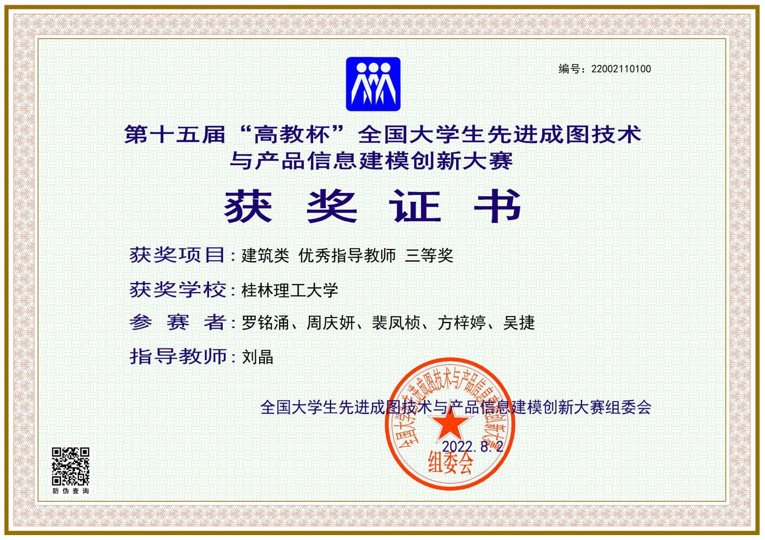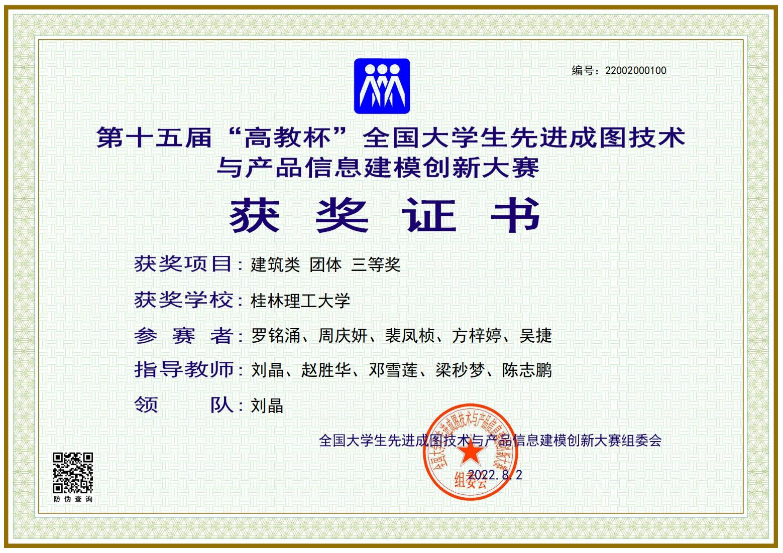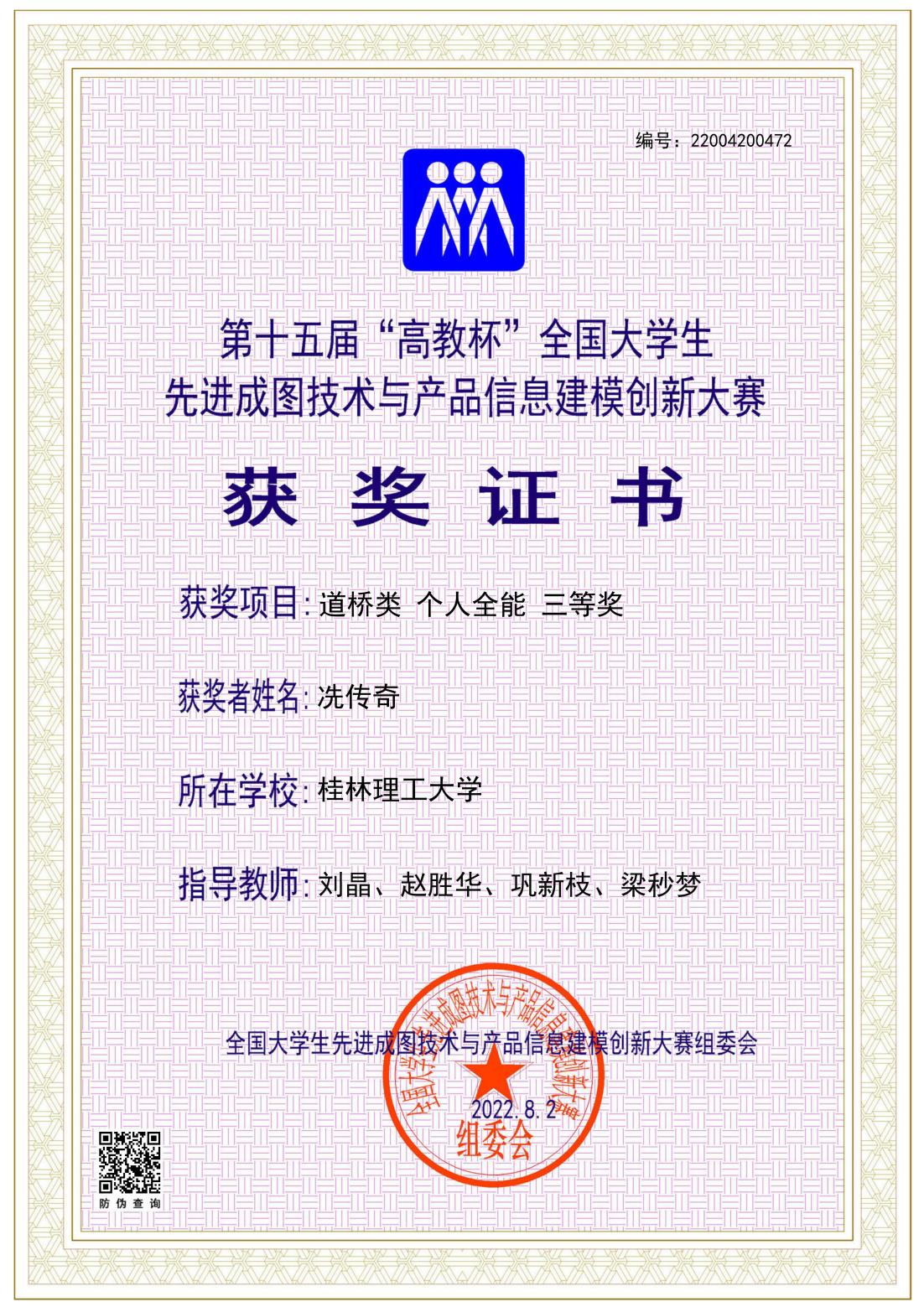 我院承办校级与区级先进成图技术与产品信息建模创新大赛,最终选拔确定15名同学组队参加了该项赛事的建筑类团体赛和个人单项赛,其中罗铭涌、周庆研获得个人全能二等奖,陆秋彤、邹康杰、裴凤珍、梁英凤、方梓婷、周家鸿、吴婕、卢琳方获得了个人全能三等奖,罗铭涌、周庆研、裴凤珍、方梓婷、吴婕获得团体三等奖;4名同学组队参加了该项赛事的道桥类个人单项赛,其中冼传奇获得了个人全能三等奖;5名同学组队参加了该项赛事的水利类单项赛,其中周佳鑫获得了个人全能三等奖。这是我校学生第六次参加该项赛事,并取得较好成绩。