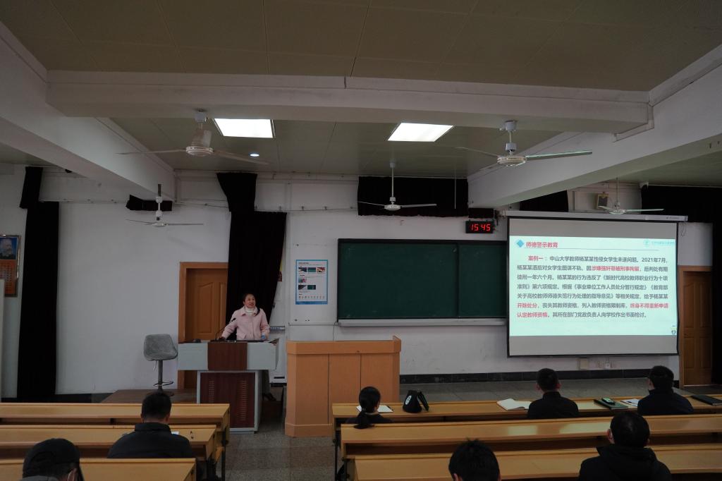唐副书记首先组织观看了榜样力量:点亮乡村女孩人生梦想的优秀人民教师——时代楷模张桂梅的感人事迹,号召大家以张桂梅同志为标杆,学习她信念坚定、对党忠诚的政治品格;学习她情系群众、一心为民的真挚情怀;学习她爱岗敬业、无私奉献的高尚情操;学习她坚毅执着、顽强拼搏的意志品质,争做“四有”好教师,为实现中华民族伟大复兴的中国梦奉献自己的一切。随后,就中山大学、辽宁大学教师师德失范行为警示教育案例进行了通报并做警示教育。