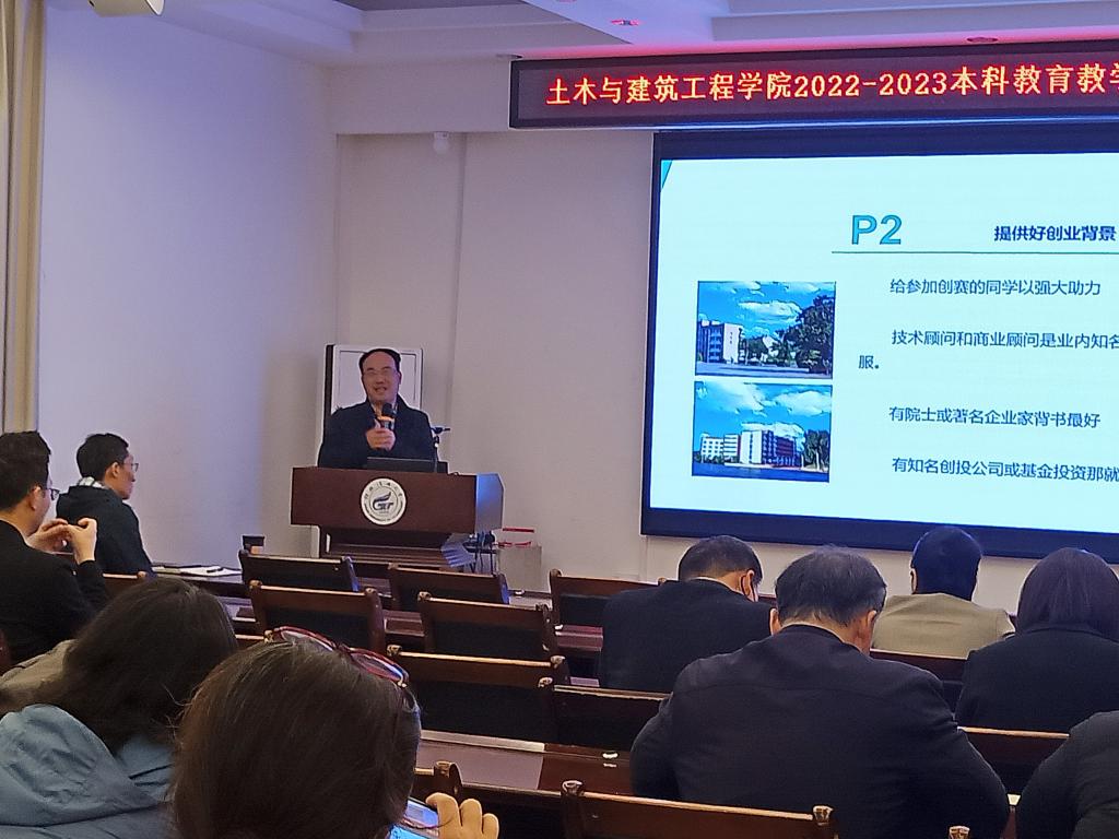 余文成副院长首先致辞,总结我院去年本科教育教学工作任务完成情况、关键举措和成效、重点就日常教学管理、一流专业建设、学科竞赛获奖、课程和教学团队建设情况、教学成果项目等方面进行说明,并对今后本科教育教学作了展望。
