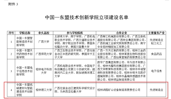 近日,广西壮族自治区教育厅发布了《关于公布广西壮族自治区市域产教联合体等立项建设名单的通知》(桂教职成〔2024〕16号),全区此次共有10所中国-东盟技术创新学院获批建设,我院申报的《中国—东盟低碳建材与智能建造技术创新学院》位列其中,这也是我校目前唯一获批立项建设的中国-东盟技术创新学院。
