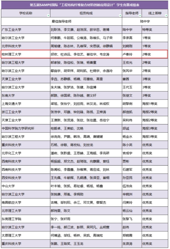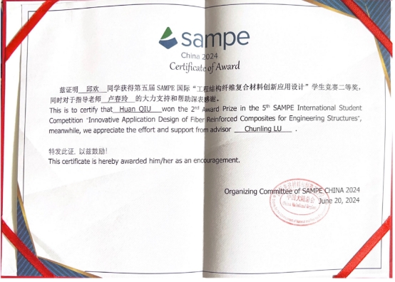 2024年6月20日,第五届SAMPE国际“工程结构纤维复合材料创新应用设计”学生竞赛在北京落下帷幕。我校土木工程学院卢春玲教授带领“创意纤构”团队(团队成员:邱欢、杜诗远、李佳艺、崔佳华、韦定涛)斩获大赛二等奖。