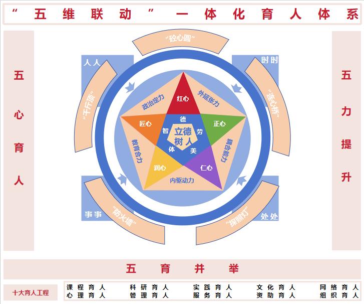 土木工程学院坚持以习近平新时代中国特色社会主义思想为指导,深入贯彻落实习近平总书记关于教育的重要论述和关于广西工作论述的重要要求,全面贯彻党的教育方针,紧紧围绕立德树人根本任务,积极探索学院党建和业务工作“双融双促”,围绕“一体化育人合力、一体化育人载体、一体化育人实效”三方面建设,遵循“育人为本、协同联动、目标引领、全面推进”的原则,按照“统一部署、系统设计,分步实施、重点先行,多措并举、长期坚持”的规划,把促进学生成长成才作为一切工作的出发点。学院紧紧结合学科特色和专业优势,着眼于党的事业后继有人这一根本大计、着眼于为奋力谱写中国式现代化广西篇章提供人才支撑这一战略要求、着眼于学院加快发展高质量发展这一现实需要,将立德树人根本任务之“德”与工程专业之“匠”相融,以“五心育人·五度融合·五育并举·五力提升”构建“五维联动”一体化育人体系,打造人人、事事、时时、处处立体化的育人矩阵,形成新时代“三全育人”的体系空间,打通育人“最后一公里”。