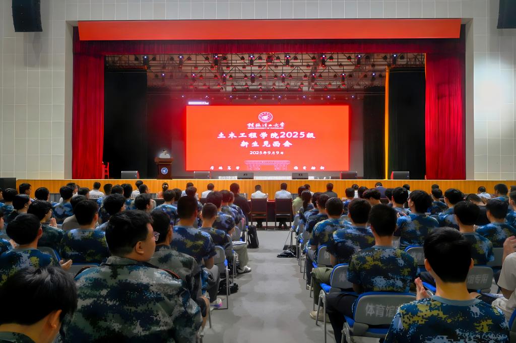 2025年9月9日晚,土木工程学院2025级本科新生见面会在桂林理工大学雁山校区新体育馆举行。学院全体领导、教师代表及2025级全体新生参加会议。会议由学院党委副书记徐时主持。