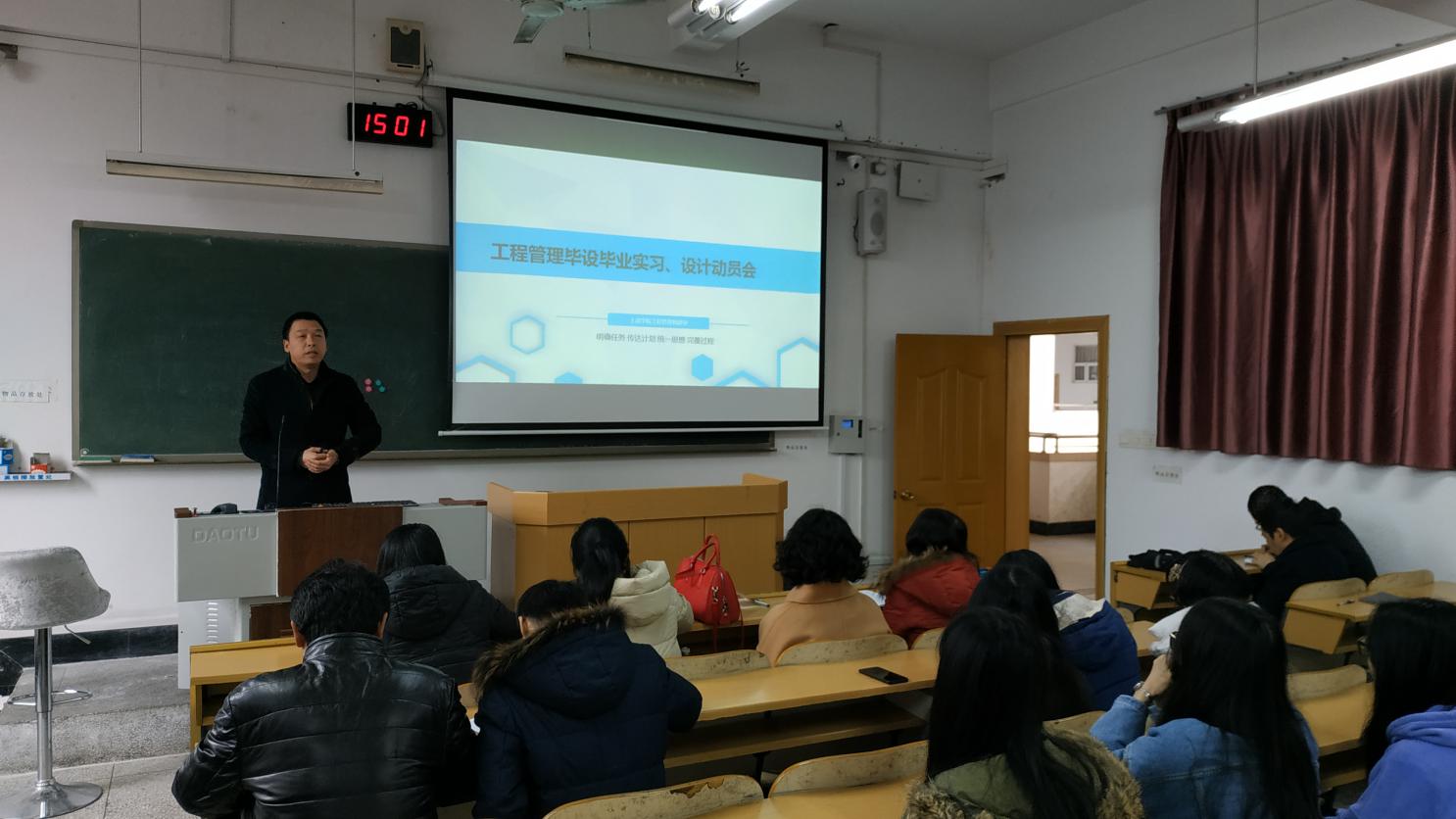 为进一步落实本科毕业设计工作,2019年2月26日下午15点,工程管理教研室全体教师以及2015级工程管理专业学生在9305召开“2015级工程管理专业实习、设计动员大会”。会议由教研室主任戴成元主持,会上戴老师结合新修订的《桂林理工大学毕业实习与毕业设计(论文)管理规定》的文件精神做了详细解读,并围绕毕业实习、设计的重要性和目的、主要环节、各环节常见的问题及注意事项进行说明强调。他根据目前建筑行业中新技术、新工艺和新材料的特点,结合工程管理未来发展趋势,要求同学们要在毕业设计中融入BIM技术,并要求在毕业实习期间要熟悉相关BIM规范和标准,在设计过程中要注意把握时间节点,在学术诚信上要有底线意识,认认真真、踏踏实实地完成大学最后一个环节——毕业设计。
