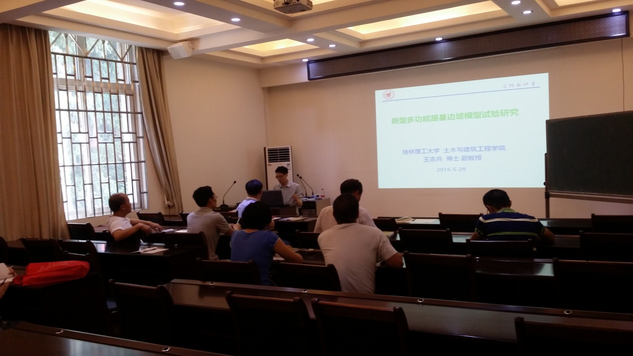 谭主任首先介绍了教研室获得的校级教学建设项目情况,安排了具体的工作计划和人员分工。王志兵老师针对《道路工程系列课程群》教育改革项目的建设工作,以“新型多功能路基边坡模型试验研究”为题作了交流发言。