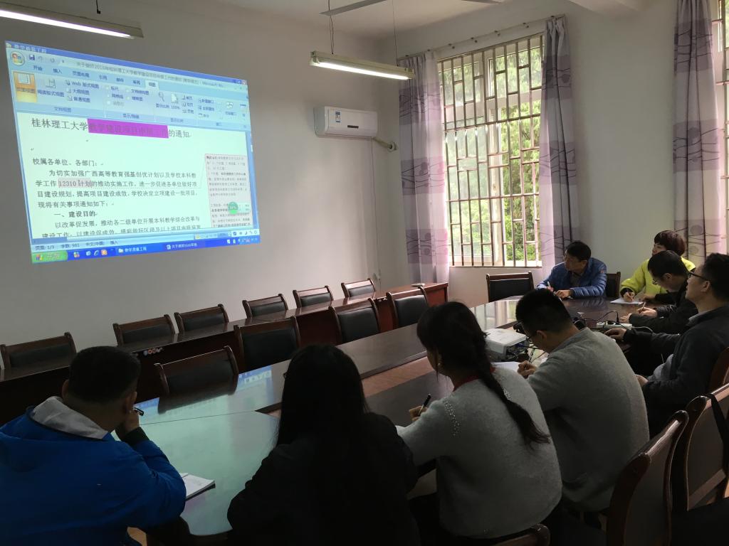邓主任针对《关于做好广西高等学校强基计划及2016年度桂林理工大学教学建设项目申报》的通知,向教研室老师进行了相关内容的传达和相关申报工作的动员及落实。邓主任针对“12310工程”、校际交流育人项目、创新创业教学团队、协同育人平台、大学生校外实践教育基地、课程教学方法及考核方式改革、示范网络课程等项目,结合教研室实际的师资力量、特长优势和发展方向,鼓励各位老师积极申报有关项目,积极推进相关工作落实。