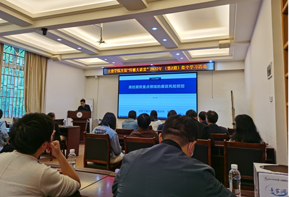 为进一步加强教师思政教育,切实提高教师职业道德水平,根据学校党委教师工作部《关于组织开展学校“师德大讲堂”2022年 (第2期)活动的通知》要求,2022年11月1日下午,我院组织师生在屏风教四楼4204会议室集中参加中国教育干部网络学院专题培训,学习清华大学廉政与治理研究中心、北京廉政建设研究基地周磊研究员题为《高校腐败重点领域的廉政风险防控》的网络视频。