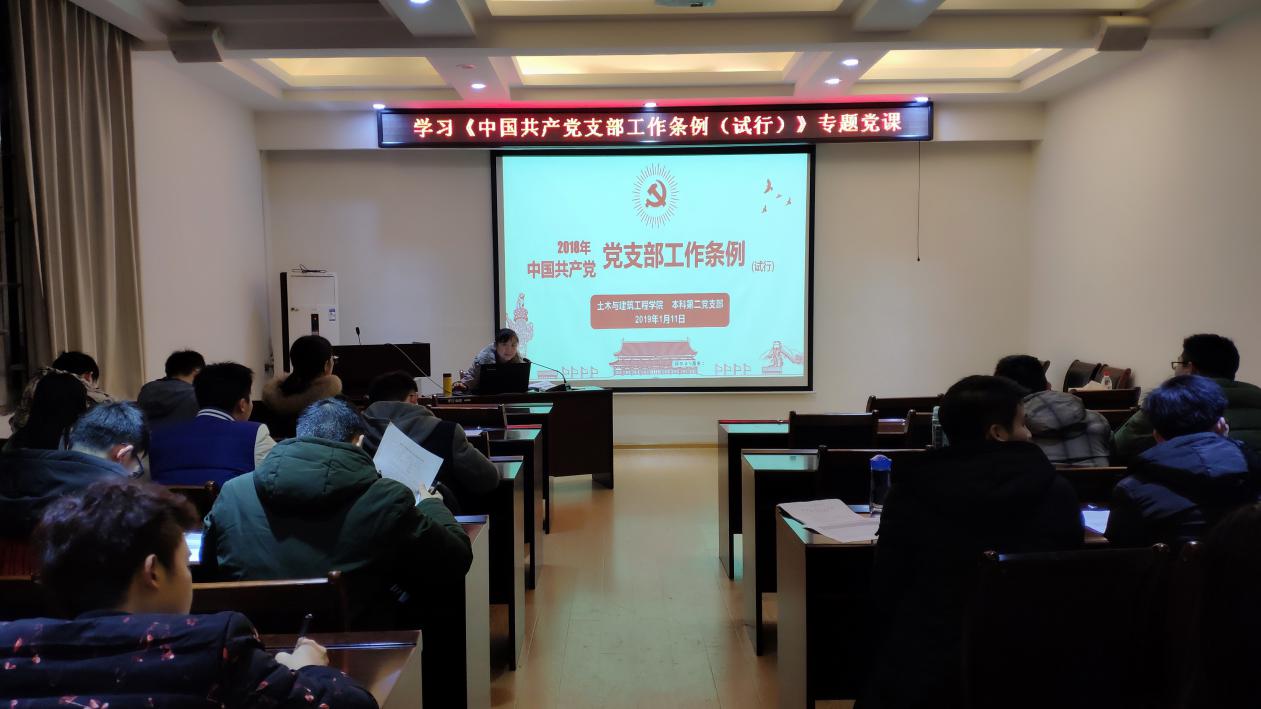 2019年1月11日,本科生第二党支部在屏风校区4204组织学习《中国共产党支部工作条例(试行)》(以下简称《条例》)专题党课,此次党课由党支部第一书记熊英书记授课,由党支部书记李晓龙同志主持召开。