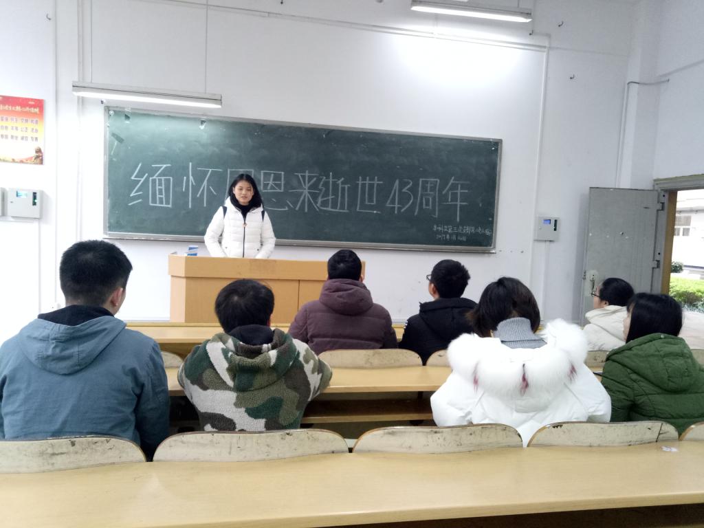 为深切缅怀周恩来总理的丰功伟绩,学习周恩来总理的精神,激励党员同志们在新时代新征程中树立干事创业的信心和决心,2019年1月14日中午,本科生第三党支部第二党小组于9115开展学习讨论会,此次会议由蒙家妃同志主持。