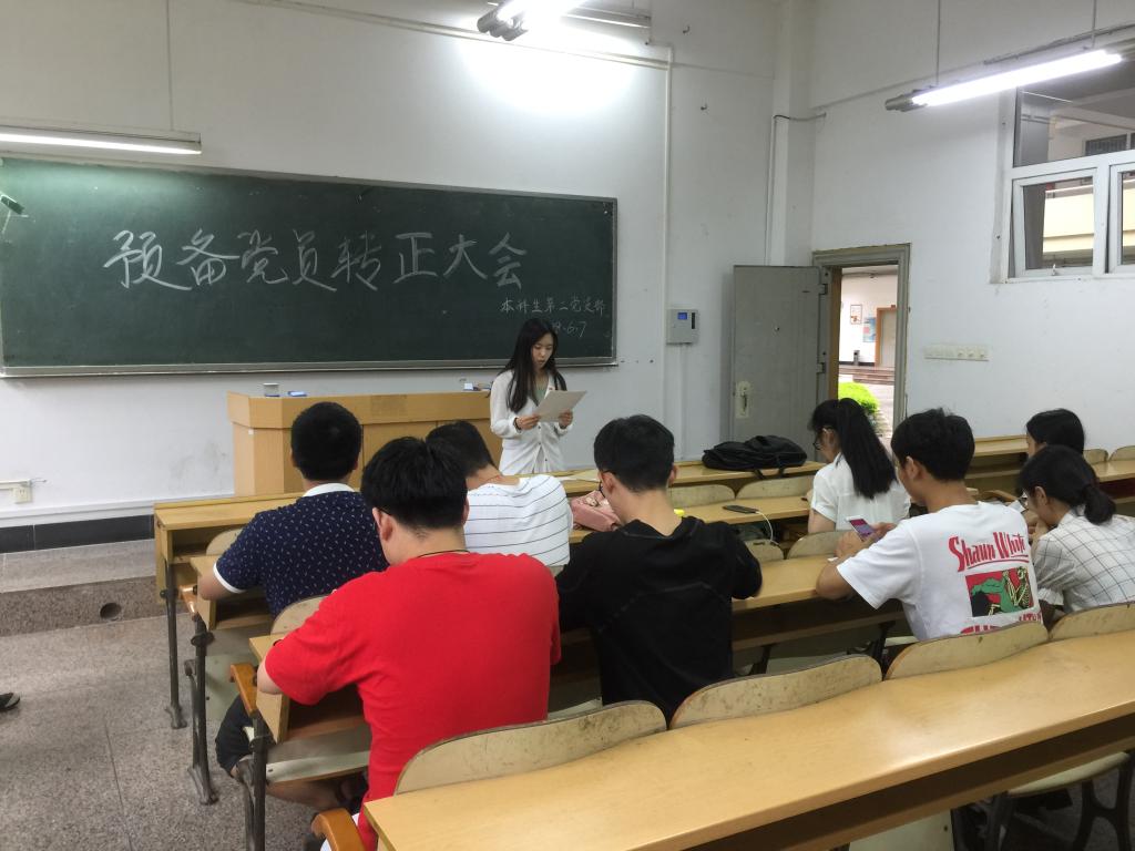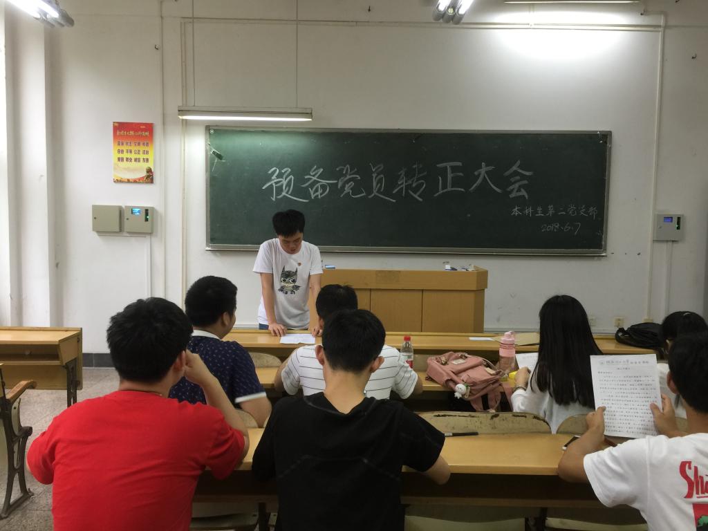 2018年6月7日下午18:00,学院本科生第二党支部召开预备党员转正会议,会议在9118举行,会议讨论了魏蔚等3位预备党员申请如期转为中共正式党员的问题。会议由支部书记李庆涛同志主持,共11名党员参加了会议。