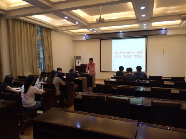 为积极响应党中央的号召,落实中央八项规定,研究生第五党支部于2017年5月17日晚在4204开展了以“中央八项规定党员‘回头看’”为主题的例会,会议由研五支部书记张书强同志主持。