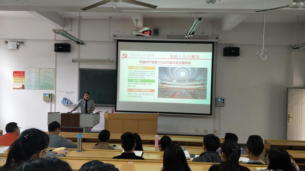 11月9日,学院党委委员唐丽华老师为研究生第三、第四党支部全体党员同志讲授了学习党的十九大报告的专题党课。在课上,唐老师深入的讲解了习近平总书记治国理政的方针政策,通过短视频、图片等一系列方式生动形象的展现了近五年中国在以习近平同志为核心的党中央领导下,发生的翻天覆地的变化。
