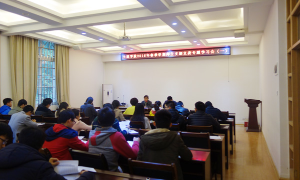 首先,王盛副书记从确定范围、组织领导、确定条件(基本条件和必要条件)、名额分配、工作进程、工作要求等方面就《关于做好学院2016年春季学期入党发展对象确定工作的通知》进行了详细的解读。熊书记就2016年春季发展党员工作部署会进行了补充说明。最后,与会人员就通知中存有困惑的地方,进行了提问,两位书记一一作了解答。之后, 熊英书记对“监督执纪四种形态”、“四个足够自信”“五大发展理念”等党的最新理论知识进行了解读,强调所有支部支委要仔细学习新的党的理论知识,提升自身的工作能力和工作水平,切实做好党支部的各项工作。