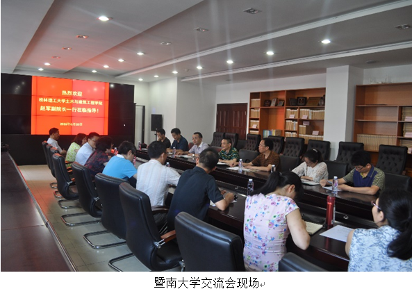 暨南大学理工学院陈振强院长、黄睿副书记、力学与土木工程系王璠主任、黄世清副主任及教师代表参加了交流会,对我院教师的到访表示了热烈欢迎,陈院长表示愿与我院建立定期互访机制,在学术研究、工程项目方面开展合作,并在住建部专业评估中保持信息互通、互相探讨、互相学习的机制。