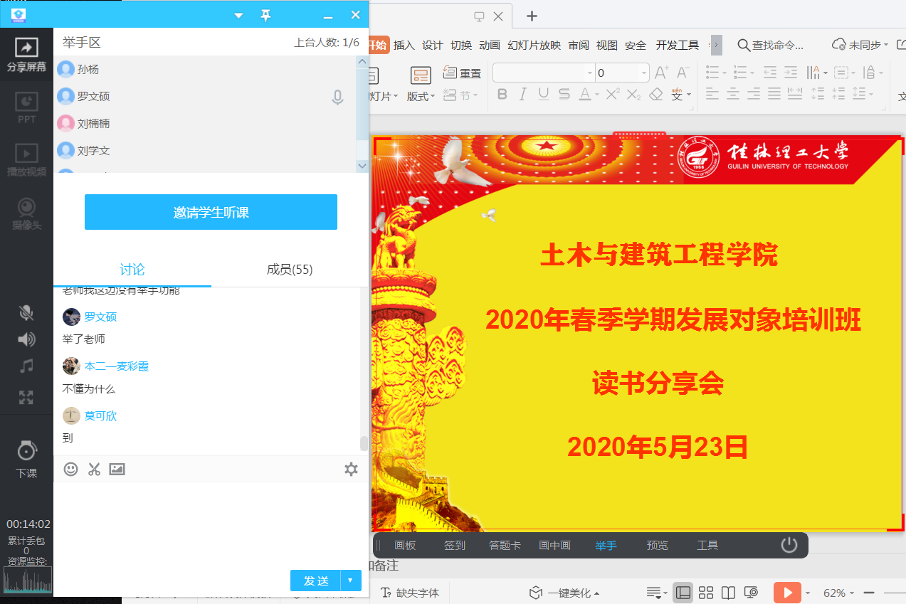 5月23日晚,土木与建筑工程学院发展对象培训班依托腾讯课堂的平台,开展了线上读书分享会,分享会由学院党建组织员马文硕老师主持,培训班的全体学员参加了此次分享会。