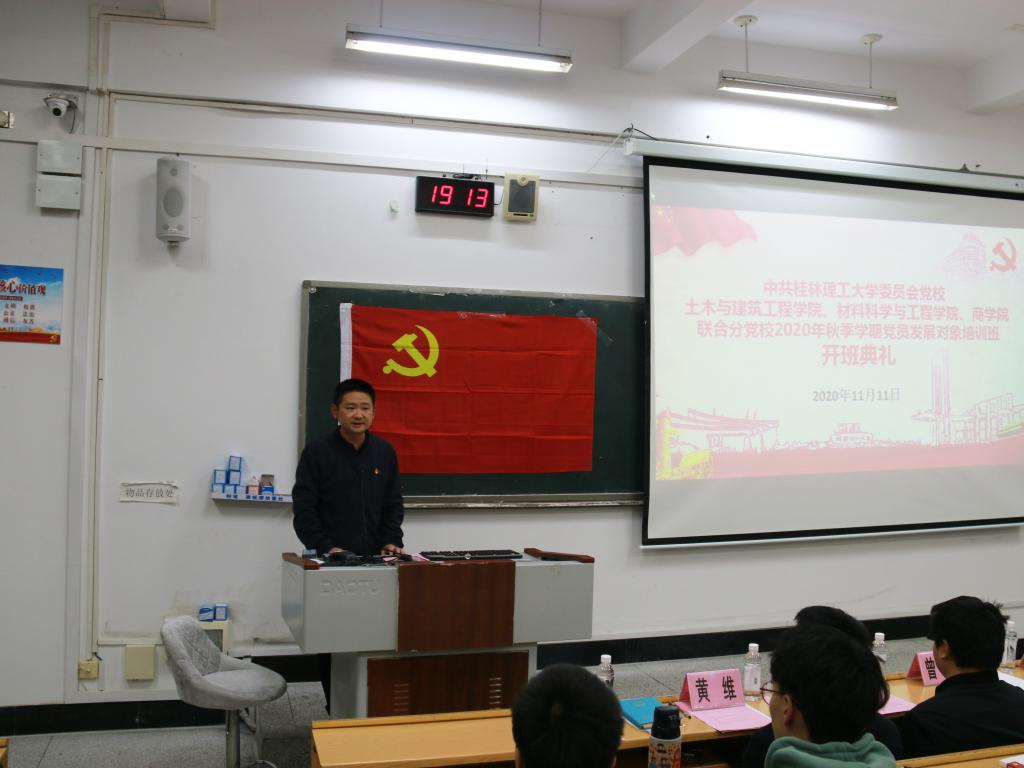 2020年11月11日晚,土木与建筑工程学院、材料科学与工程学院、商学院联合分党校2020年秋季学期党员发展对象培训班开班典礼于屏风校区教九楼607教室顺利举行,土木与建筑工程学院党委书记曾榕老师、学院副处级组织员梁保熙老师,材料科学与工程学院组织员兼分党校教务员李俊俊老师,商学院组织员梁译匀老师、商学院党校教务员黄维老师,土木与建筑工程学院分党校教务员何吉连老师和培训班149名发展对象参加了本次开班典礼,开班典礼由土木与建筑工程学院分党校教务员经玲老师主持。