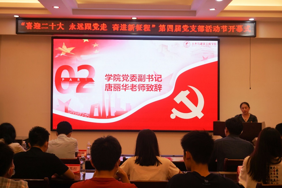 开幕会在庄严的国歌声中拉开帷幕。在主持人依次介绍与会领导和老师后,学院党委副书记唐丽华老师上台致辞。她强调,党支部活动节的举办促使我院党建工作不断完善,学生党务中心逐渐茁壮成长,学院党组织的号召力、凝聚力、战斗力不断加强。本届党建文化节以“喜迎二十大 永远跟党走 奋进新征程”为主题开展,贯彻落实党的十九大精神和习近平总书记重要讲话精神,旨在提高党员党性修养,推动学院党建工作的发展。唐丽华老师最后宣布,土木与建筑工程学院“喜迎二十大 永远跟党走 奋进新征程”第四届党支部活动节正式开始。