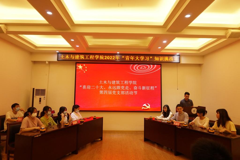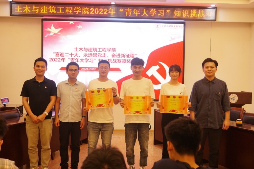 开幕会后,现场举行了土木与建筑工程学院2022年“青年大学习”知识挑战赛决赛。决赛由初赛总分前8名党支部代表队参加,比赛以现场知识抢答赛进行。经过三轮角逐,本科生第二党支部、研究生第六党支部、研究生第五党支部总分排名前三,分别获得一等奖和二等奖,并由安邦国老师、司富远老师、谢基柱老师为获奖支部代表颁奖。