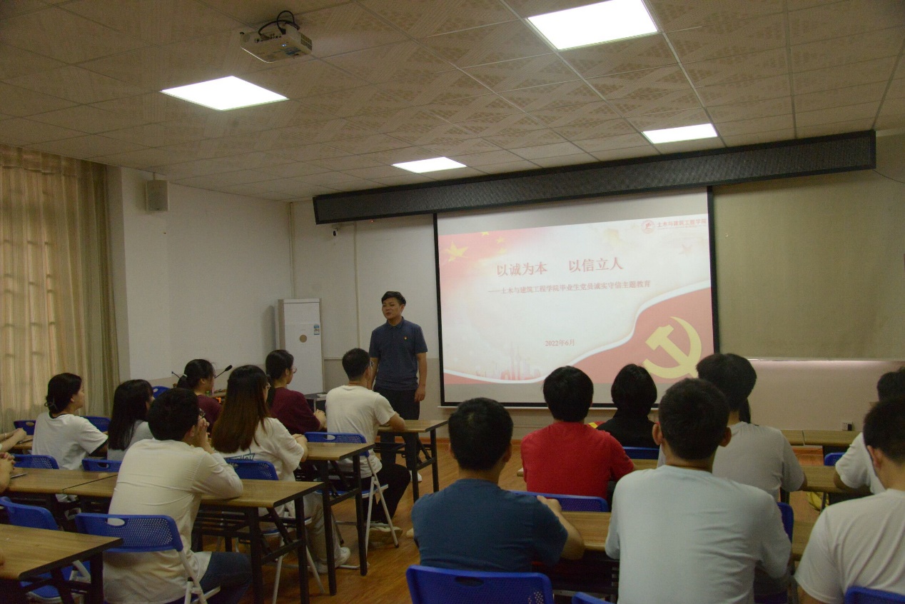 为引导毕业生党员自觉培育履行诺言、爱岗敬业、自立自强的品格,深入践行社会主义核心价值观,树立诚信理念、强化诚信意识、培养诚信品质,建设“人人知诚信、处处讲诚信”的健康和谐校园。6月7日上午,学院在4203举行毕业生党员诚实守信主题教育活动。活动由学院党务中心指导老师、专职辅导员司富远主持,各党支部毕业生学生党员代表参加此次活动。