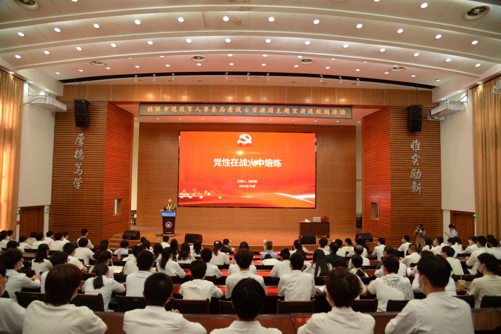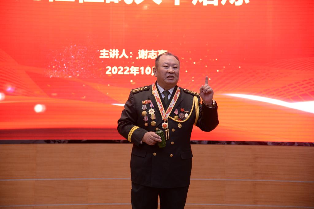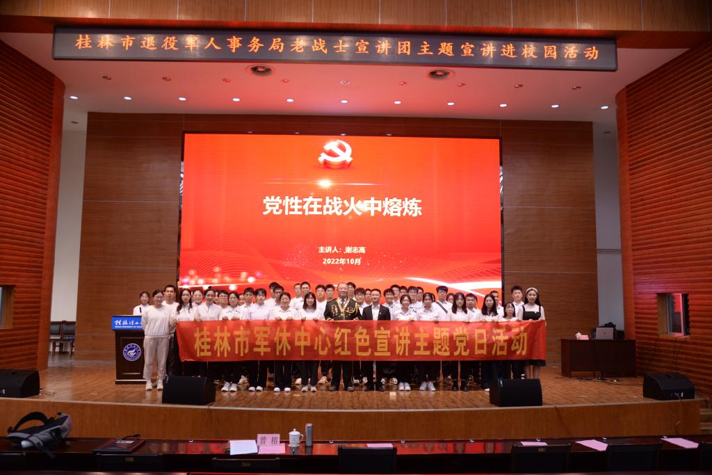 10月18日下午,学院党委邀请到原广州军区综合训练基地副司令员、大校,现桂林市退役军人事务局“老战士宣讲团志愿服务队”队长谢志高同志。在屏风校区图书馆报告厅为学院师生党员、学生干部进行“庆贺党的二十大,砥砺党性再启航”主题党课教育,学院党委书记曾榕主持本次主题党课。