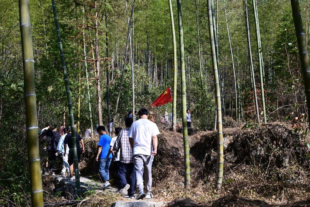 重走红军路——翻越老山界。党员们跟着高举的党旗,在老山界密林崎岖路上,沿着当年红军的足迹,体验红军长征时翻越老山界的艰辛险阻。纵使山路崎岖,党员们依旧保持着高昂的热情,以红军当年“一不怕苦、二不怕死”的长征精神,走完红军长征路——翻越老山界。