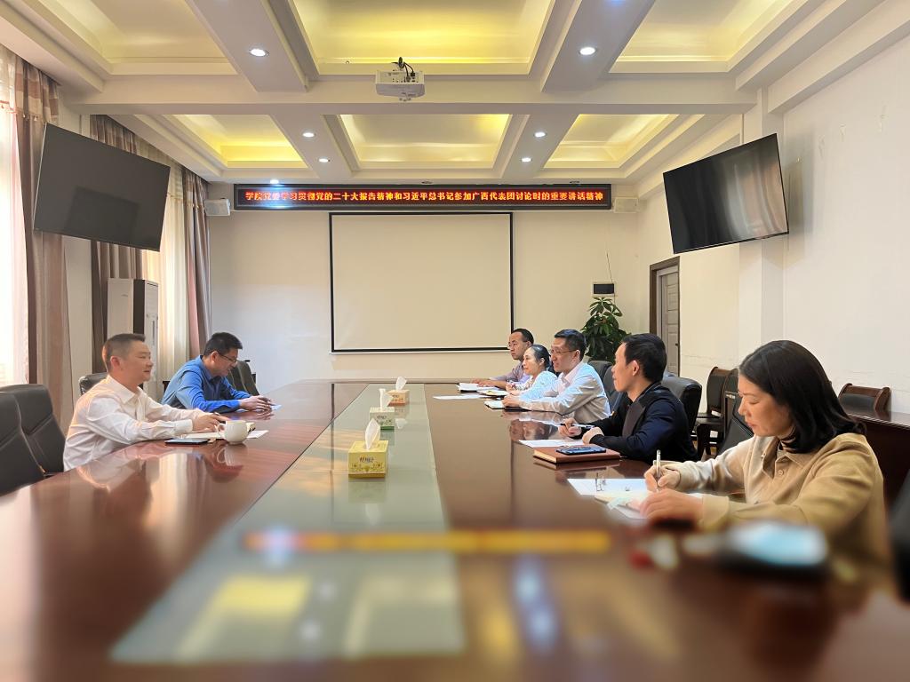 曾书记强调,习近平总书记在参加广西代表团讨论时指出,党的十八大以来,广西壮族自治区党委和政府贯彻落实党中央决策部署,团结带领全区各族人民统筹推进“五位一体”总体布局、协调推进“四个全面”战略布局。学院工作要以党的二十大精神为指引,深入践行新发展理念,坚决贯彻党中央决策部署,撸起袖子加油干,一步一个脚印把党的二十大作出的重大决策部署付诸行动、见之于成效。