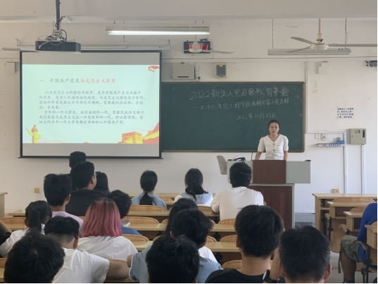 2022年10月23日,土木与建筑工程学院本科生第二党支部在雁山校区05207对2022级新生土木工程2022-3班、土木工程2022-4班学生开展了入党启蒙教育。此次入党启蒙教育的目的是:进一步加强2022级新同学对党的认识和了解,激发全体同学的入党积极性,端正入党动机。