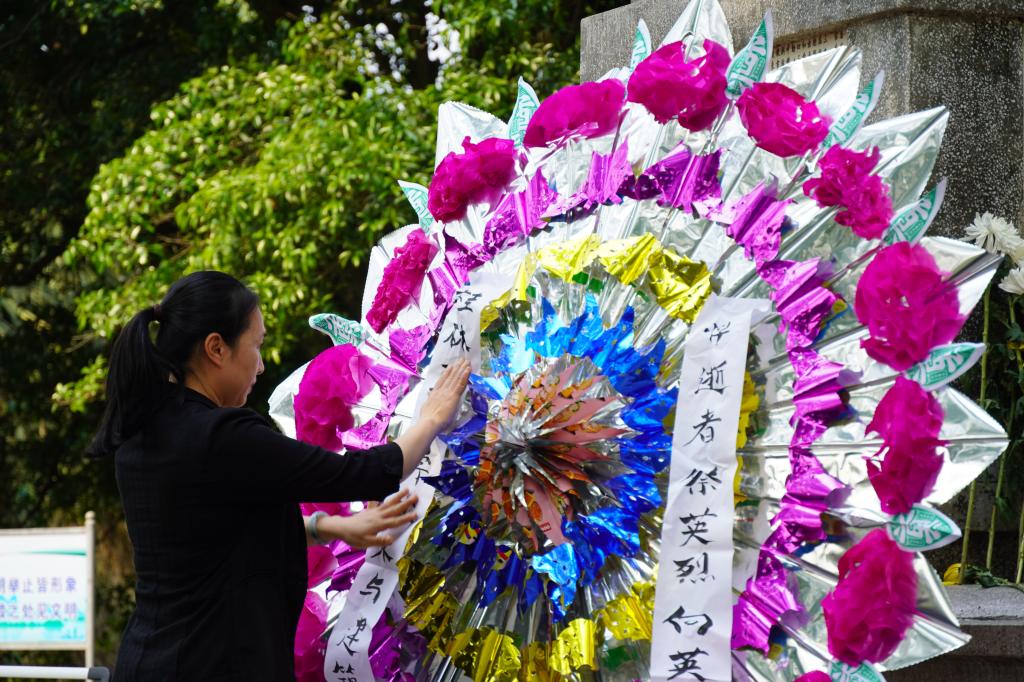 讲解结束后,全场庄严肃穆。大家怀着崇高的敬意向革命烈士纪念碑集体默哀三分钟,以无限的哀思表达对革命先烈的缅怀之情。默哀结束,同学们向革命烈士三鞠躬并敬献花圈, 唐丽华副书记上前整理挽联。