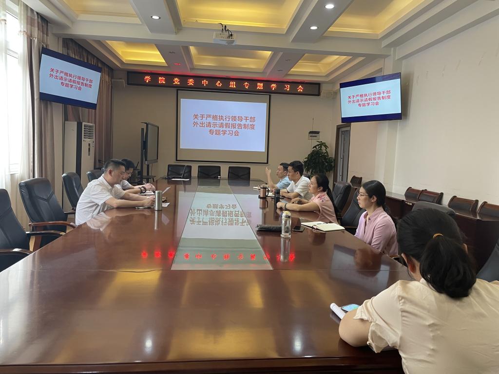 曾书记首先领学了学校印发的《关于进一步加强中层干部外出请示请假报告工作的通知》,细致研究了《通知》中提及的九个方面内容。并指出,学院各领导干部要严格贯彻执行有关规定,按照外出请示报备工作规范执行,严防外出不请示报备或请示报备不及时、不规范的情况发生。