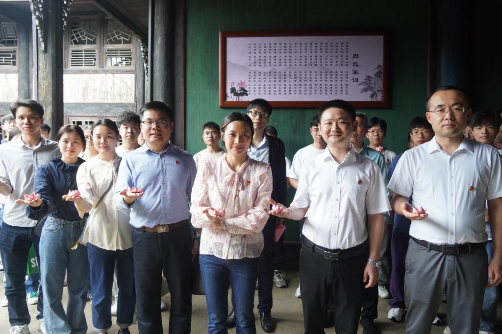在爱莲家祠大厅周恩来总理题写的“爱莲堂”匾额下、北宋周敦颐的画像旁,全体师生党员通过集体现场朗诵其传世名篇《爱莲说》,再次领略了周氏家族“出淤泥而不染,濯清涟而不妖”的清廉家风文化魅力。诵读完毕,大家还以“莲与廉”为主题,现场一起手工折“莲”。通过动手折“莲”,用心记“廉”,以行践“廉”,不断加深对清廉文化内涵的理解。